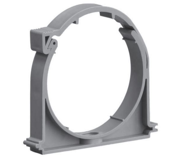 Хомут используется для фиксации элементов внутренней канализационной системы, выпускается диаметром 40 мм. Расстояние между хомутами должно составлять: для горизонтальных линий - 10 диаметров прокладываемой трубы, для вертикальных линий (для стояков) - 1000 - 2000 мм. Материал хомута - полипропилен.